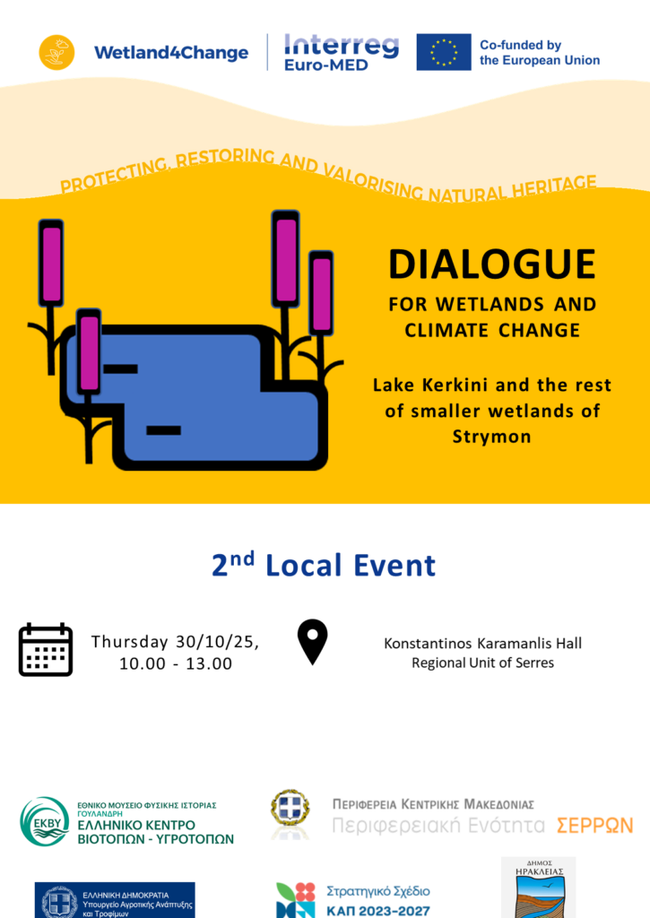 EKBY, in collaboration with the Regional Unit of Serres, the Municipality of Iraklia, and the Special Management Service of the SP CAP 2023-2027, invites stakeholders to the 2nd Local Event of the Wetland4Change project, taking place on Thursday, 30 October 2025, at the “Konstantinos Karamanlis” Hall of the Regional Unit of Serres.